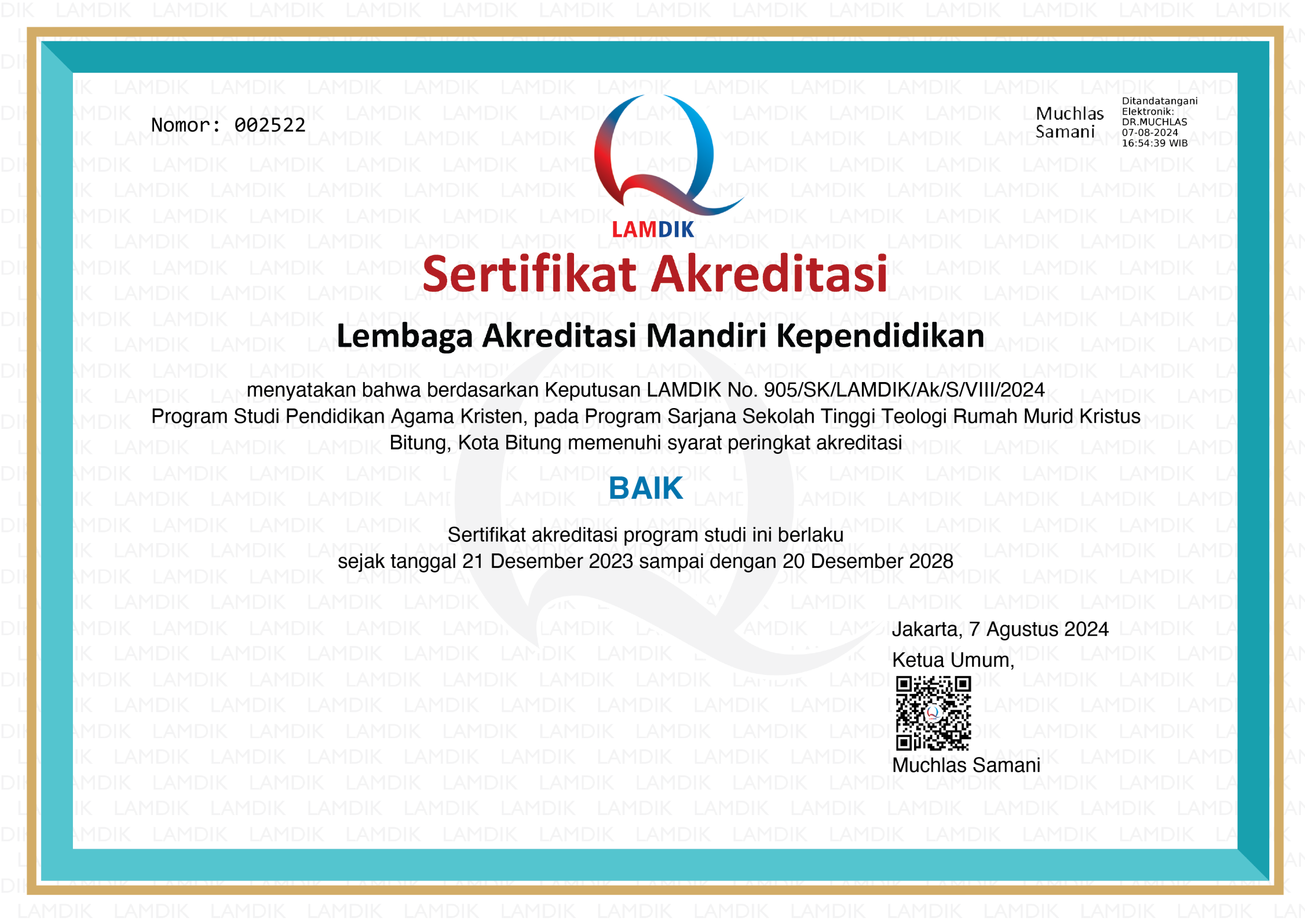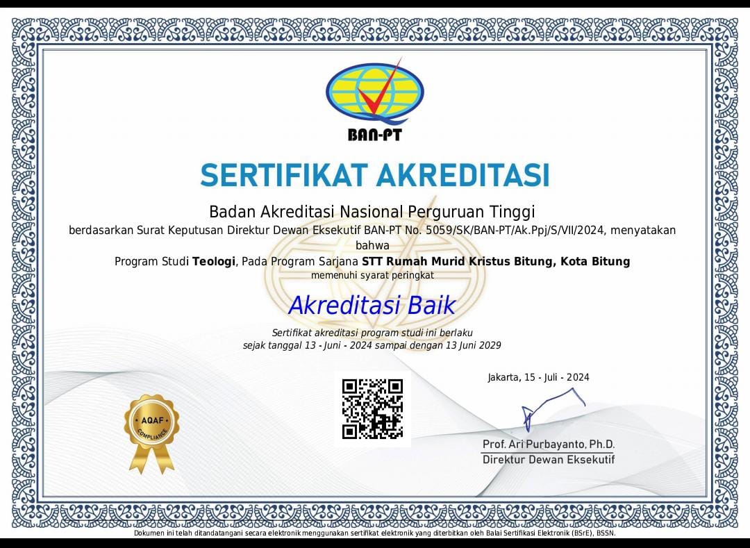 Program studi Sarjana Teologi (S.Th.) juga telah memperoleh akreditasi BANPT dengan nomor 5059/SK/BAN-PT/Ak.Ppj/S/VIl/2024, demikian pula program studi Sarjana Pendidikan Agama Kristen (S.Pd.) telah memperoleh akreditasi LAMDIK dengan nomor 905/SK/LAMDIK/Ak/S/VIll/2024.